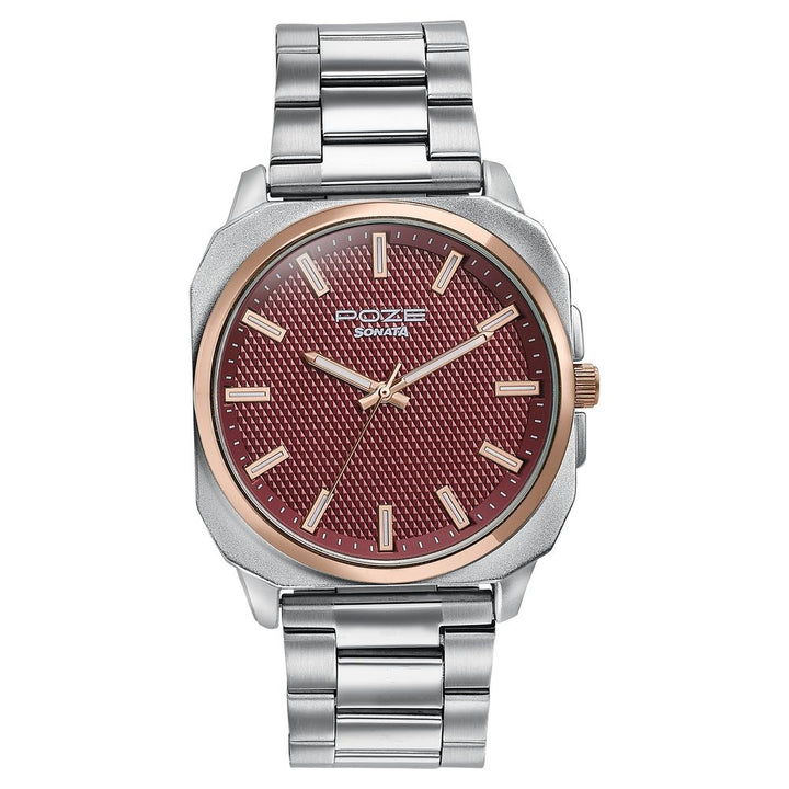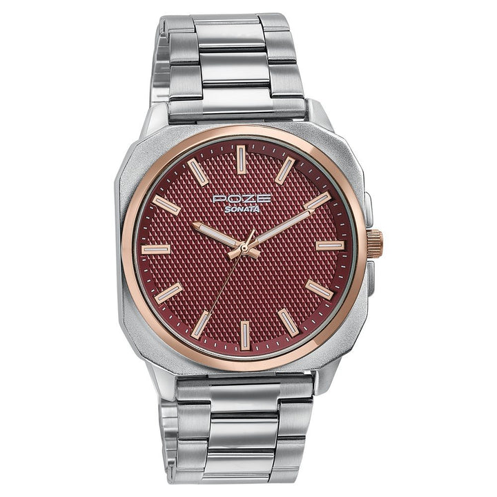 Sonata Poze Quartz Analog Red Dial Silver Metal Strap Watch For Men offers a stylish and modern look with a bold red dial and premium metal strap. Powered by reliable quartz movement, this timepiece ensures smooth performance and durability, making it perfect for both casual and formal wear.
