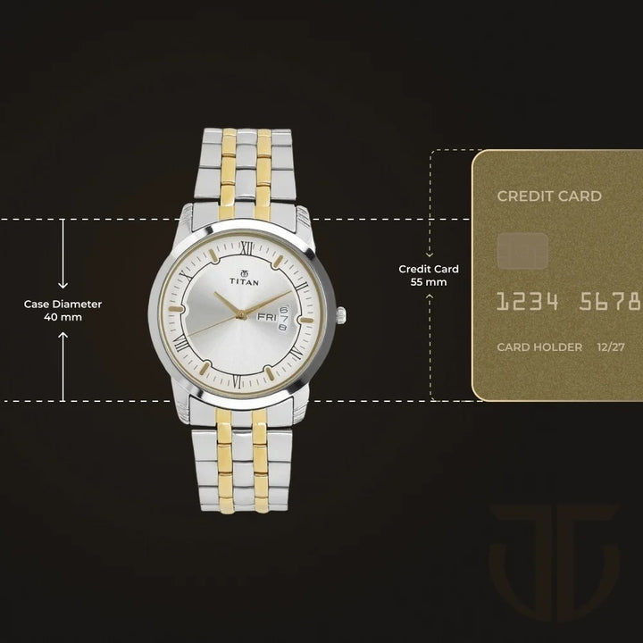 | Name | Titan Metal Silver Analog with Day and Date Stainless Steel Strap Watch for Men | Case Shape | Round |
